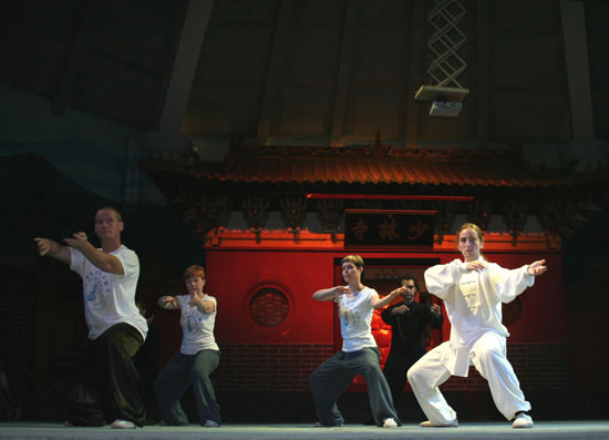 中外高手同台献艺,少林太极交相生辉。9月5日上午,少林寺武术馆演武厅内热闹非凡,欧洲少林武术联盟会弟子与武术馆表演队员同台表演,精彩的少林功夫、太极拳和跆拳道展示令观众目不暇接,不停的报以热烈的掌声。