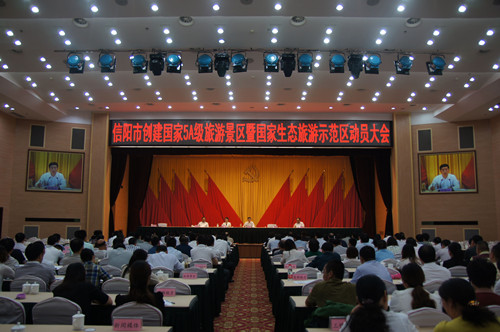 8月13日,信阳市召开创建国家5A级旅游景区暨国家生态旅游示范区动员大会。本次会议宣告鸡公山、灵山联合创建国家5A级旅游景区和南湾湖创建国家生态旅游示范区工作启动。市委副书记、市长乔新江,市委常委、副市长冯鸣,市人大副主任董进才,市政协副主席王勇等市领导出席会议。会议由副市长杨慧中主持召开。各县(区)县(区)长、分管副县区长、旅游局长及部分创建工作涉及到的乡镇、办事处主要负责同志,全市50多个创建工作指挥部成员单位主要负责人,3家创建景区班子成员,以及全市3A级以上景区、三星级饭店和部分市直旅行社参加了会议。