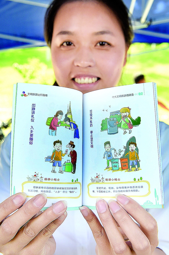 5月19日,工作人员展示活动现场免费发放的文明旅游出行指南。