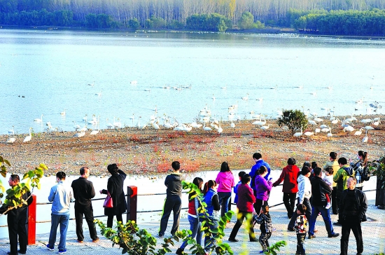 11月1日,三门峡天鹅湖国家城市湿地公园游人如织,人们纷纷来这里看望三门峡人的老朋友——白天鹅。据悉,当天天鹅湖有白天鹅1200余只,迎接游客1万人次以上,迎来今年第一个观赏白天鹅的高潮。