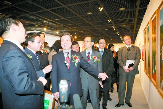 中国驻韩国大使程永华(前排左三)兴致勃勃地在云台山展位前参观并听取景区情况介绍。
