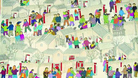 昨日,在丈夫张国中及10多名邻居的帮助下,李红云将堆绣长卷“豫北民俗过年”展现在村民面前(如图)。该幅堆绣全长28米、宽0.8米,故事从腊月二十三开始,分为请灶爷、磨豆腐、吃麻糖、爆米花、备年货、蒸馒头、贴春联、拜大年、走亲戚、看焰火、赶庙会等民俗景象。