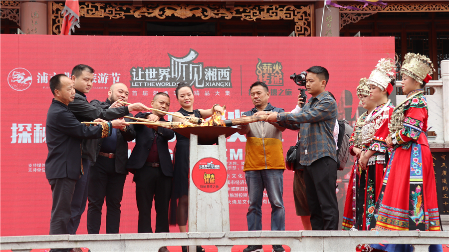 让世界“听见”湘西——中国浦市非遗旅游节非遗薪火传递仪式,于4月27日上午9:00在湘西州泸溪县白沙涉江楼前广场举行,本次活动得到了湘西州文旅局、泸溪县各级政府部门的大力支持,活动现场在泸溪县政府尚远道副县长宣布活动仪式启动后,苗族姑娘、土家小伙在祭司的引领下,用从泸溪县浦市古镇高庙文化下湾遗址所在地沅江岸边采集象征非遗传承的火种,由非遗传承人、本地乡贤、非遗保护志愿者,共同点燃了代表非遗保护传承生生不息的神圣之火,采集的火种将跟随由中国浦市非遗旅游节薪火护送工作人员、广东寻梦天下摄影俱乐部、长沙星辰在线文旅频道等单位组成的大型薪火传递团队带至下一站:保靖县吕洞山。活动承办方负责人介绍说:传递活动于4月27日至30日将纵越湘西南北,由泸溪县涉江楼至吕洞山、十八洞、里耶古镇、首八峒、到老司城,最后回到浦市古镇保存,在6月6日中国浦市非遗旅游节开幕式当天,点燃本次非遗旅游节的非遗薪火。这薪火传递的是7800年湘西人类文明起源的火种,传递湘西土、苗各民族繁衍生息生生不灭的火种,传递湘西非物质文化遗产传承与弘扬的火种,同时也是宣示浦市非遗旅游节进入倒计时的标志。