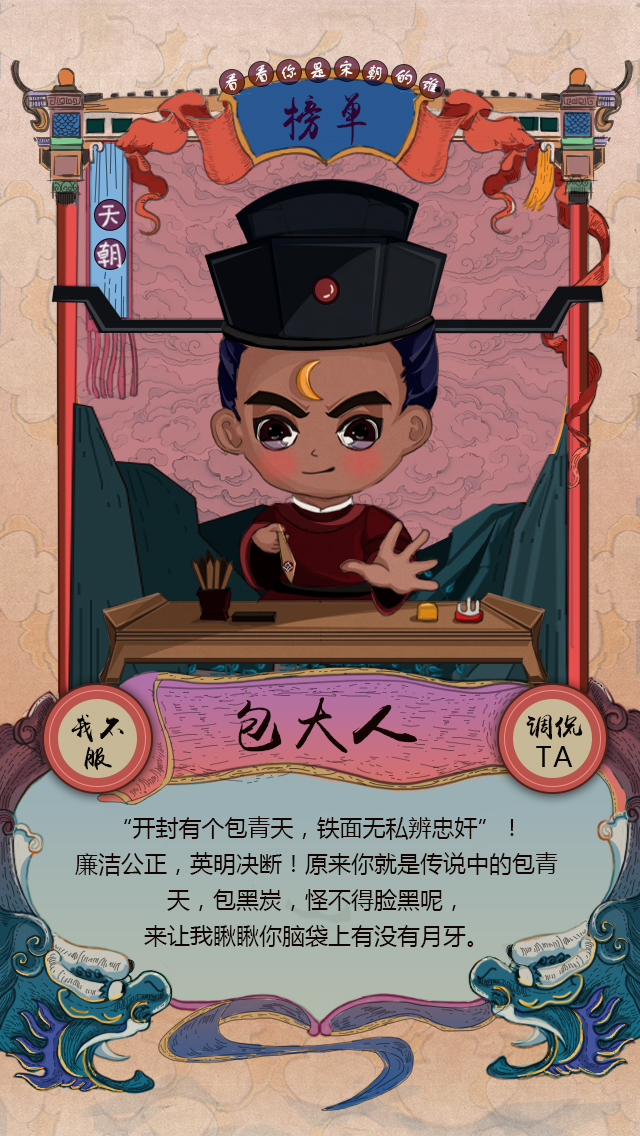 总之,整个《梦回宋朝》H5体验过程充满了奇幻、逗趣色彩,穿越感十足,只要你凭第一感觉选择穿越,最终你穿越千年“换脸”的结果有可能是包拯、岳飞、宋徽宗、李师师哦。不信,快来体验一把《梦回宋朝》H5,与千年前的你来场邂逅吧。 一朝步入画卷,一日梦回千年。长按,识别二维码,查看宋朝的你!