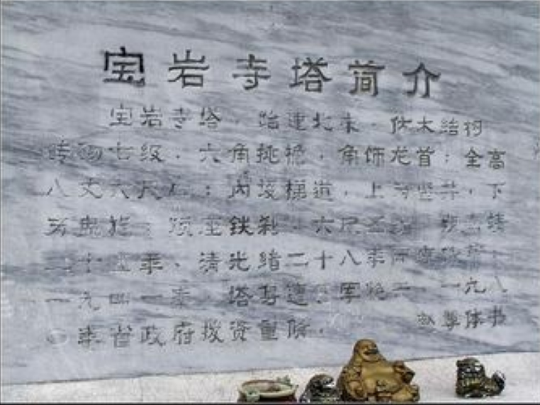 宝岩寺塔始建于北宋,已有近千年的历史;古塔为仿木结构、楼阁式、六角形、七级砖塔,塔身高28.8米。顶有铁铸塔刹,呈莲花状,高2.16米。宝岩寺塔共有七层,一、二层塔室为四角形拱顶室,台阶式盘旋梯道;三至六层为六角形拱顶室,设井式梯道,可达第六层,最高一层为第七层,到达此层不仅行走困难复杂,而且需要有专人陪同才能到达。