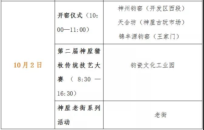 十一国庆假期中,神垕古镇每天都将有两家以上的钧瓷窑厂举行开窑仪式,方便广大游客根据情况选择观看、游玩和体验;神垕老街每天都有不同的系列活动展示轮番上演;此外,还有钧瓷艺术展、猜枚传统技艺大赛等丰富的活动穿插其中!