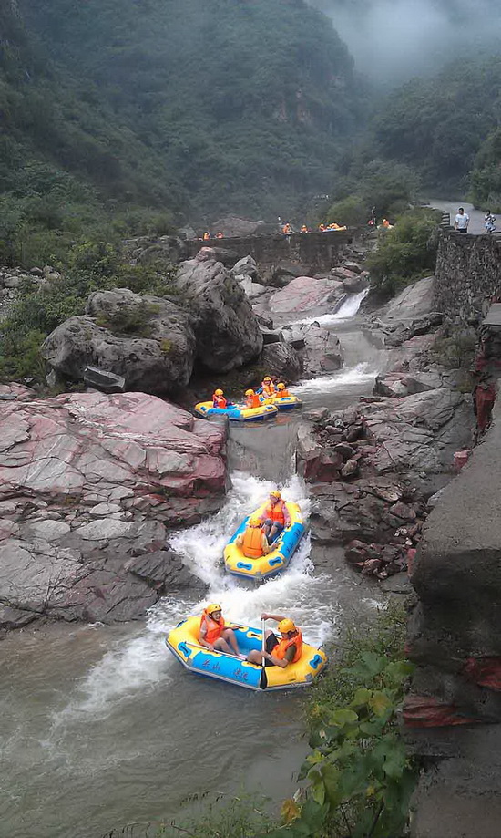 关山漂流,位于太行山南麓风景如画的关山国家地质公园内,因漂流全程均为天然泉水、水质清澈,富含多种矿物质,有利于皮肤和身体健康,而有“豫北第一漂”的美誉。