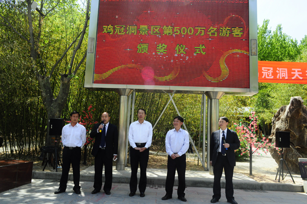 2013年,时值鸡冠洞景区开放20周年。5月1日上午,来自山西太原的连先生幸运的成为了鸡冠洞景区第500万名游客并超级幸运大奖,引得众多游人的羡慕。