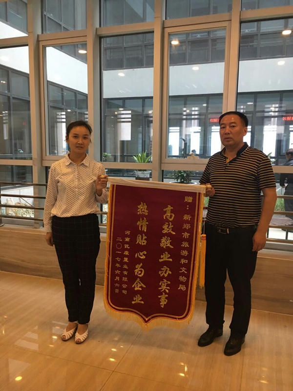 6月8日,新郑市旅游和文物局行政审批窗口获河南优康置业有限公司(原华信集团新时代广场)赠送的“高效敬业办实事,热情贴心为企业”锦旗。