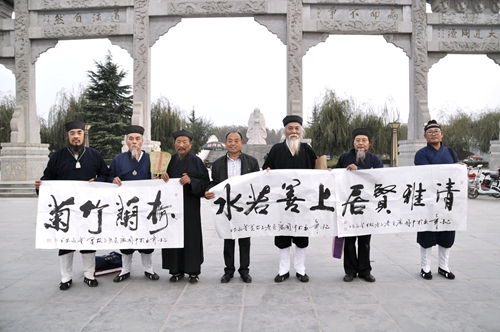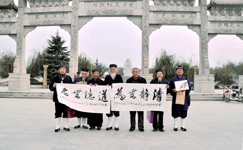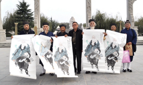 各位台湾道长首先参观了太清宫,叩拜太上老君,捐款助教,赠送道教经典书籍,向八十三岁的道教全真龙门派第十八代弟子太清宫石永田道长赠送了《积善传大道•道尊德贵现》题字,并设宴为他祝寿。在老子文化广场牌坊前,鹿邑县清代“父子三翰林”之后王元贵,鹿邑老年书画研究会会长王廷山、副会长侯晓春、常任理事董敬安、张建文等知名书法家和鹿邑文昌帝君庙刘明停道长等向台湾道长赠送了精心创作的《老子出出关图》、《老子故里八景诗》、《道隐世名》等书画作品,台湾各位高道也分别回赠了《道德经》、《清静经》以及平安符等以作纪念,并邀请各位书法家到台湾交流观光。鹿邑县旅游局工作人员向道长们赠送了老子故里宣传画册、宣传光盘、旅游地图等资料。