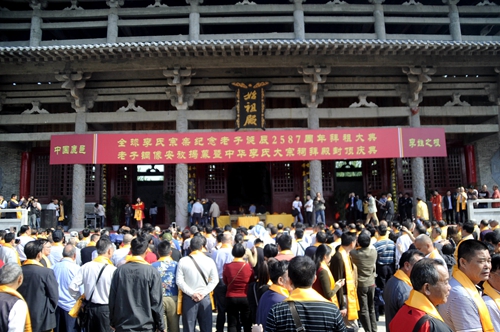 当日上午9时,在李氏宗祠始祖殿前,全球李氏宗亲拜祖大典等活动正式开始。在和煦的春风中,三牲五谷陈列,礼炮齐鸣。海外李氏宗亲代表分别为老子上香、奠酒、行三鞠躬礼。广东南雄珠玑巷李氏大宗祠管理委员会、中华李氏大宗祠筹建委员会名誉会长李克昌恭读祭文,表达了李氏后裔对老子的无限崇敬和缅怀之情。