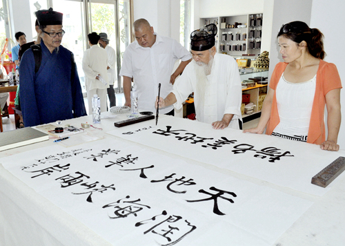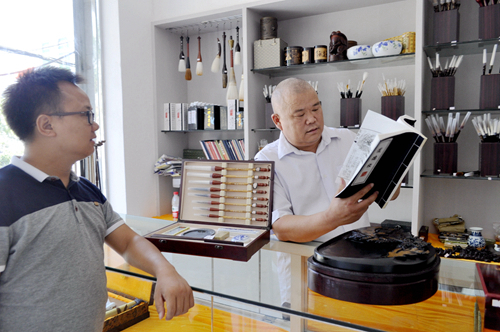 在天地人笔业公司营销旗舰店里,邱圆山道长一次购买了6000多元的各类毛笔带回台湾。他介绍说,台湾高雄老年大学的学员们通过试用,纷纷称赞天地人毛笔规格全、质量优,不仅具有使用价值,而且具有观赏和收藏价值,很受大家欢迎。他还题写了“天地人笔业 润海峡两岸”、“天地美名扬”等书法条幅赠给公司留作纪念,围观的大家禁不住鼓起掌来。(刘好亮 蒋保庆)