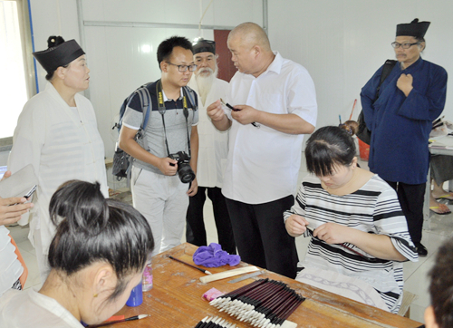 在太清产业园区天地人笔业生产基地,嘉宾们参观了生产车间、展览室,仔细查看了每一道毛笔制作工艺。看到员工们认真按照上千年来的传统手工技艺制作出的一支支精美耐用的各类毛笔时,大家纷纷用手机、相机拍照。经理刘永杰介绍了公司在县委县政府重视下,文化、旅游、教育、文联等部门积极支持,传承老子思想的“道法自然”、“上善若水”等精髓,采用非物质文化遗产保护项目散卓制笔法开发研制的《道德经》套笔、道家文化套笔、周口三宝套笔等诸多新品种广受市场欢迎;尤其是随着教育部部署的推进书法进课堂要求,生产的学生毛笔款式多、质优耐用,成为了广大中小学生的必备用品。公司也作为老子故里知名文化旅游企业,产品成为当地文化旅游指定产品,多次被推选参加了中国国际旅游商品博览会、国际文化产业博览交易会、中原文化产业博览交易会、中原旅游商品博览会等大型活动,屡获奖项,广受好评并订单不断。