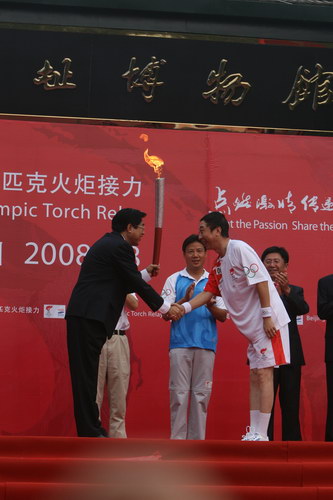 中共房山区委书记聂玉藻将火炬交给第一棒火炬手冯巩。缪礼东摄