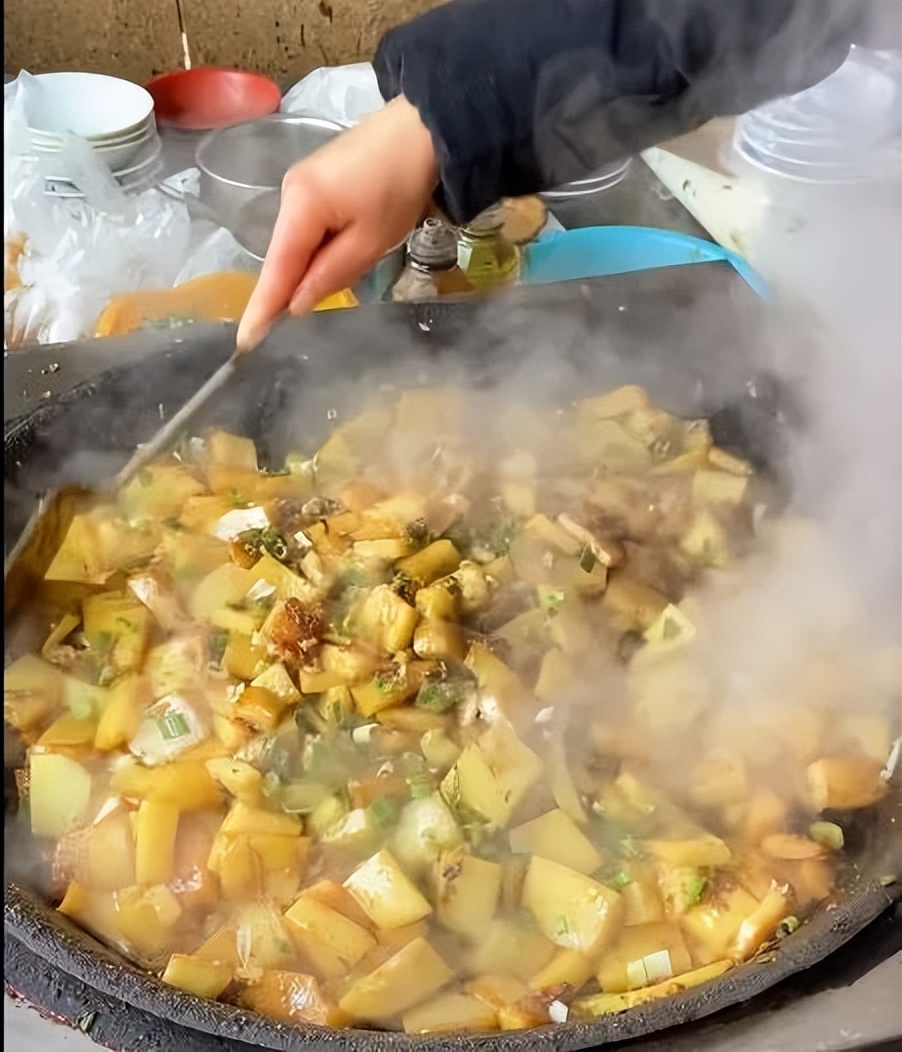 源自宋朝的炒凉粉,将成形的凉粉在平底锅内翻炒,添大量的蒜泥、豆酱葱花、生抽之类调味料,炒出香脆的锅巴来。