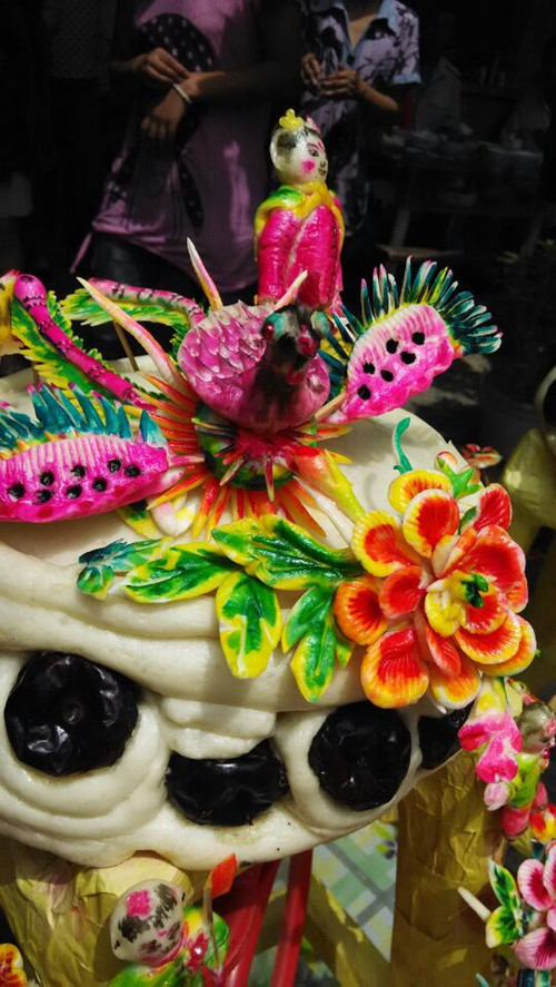 灵宝面塑制作独特,色彩丰富,并有“二龙戏珠”、“龙凤呈祥”“莲生贵子”等造型,很有河南民间艺术特点。面花在捏制时,中间要做一组较大的面花,如:龙、凤、莲花、牡丹等,取其二龙戏珠,太子坐莲,凤戏牡丹之意,四周配以各种人物、花鸟、虫草走兽等,寓意婚后美满幸福,多子多福、生儿成龙、育女成凤。