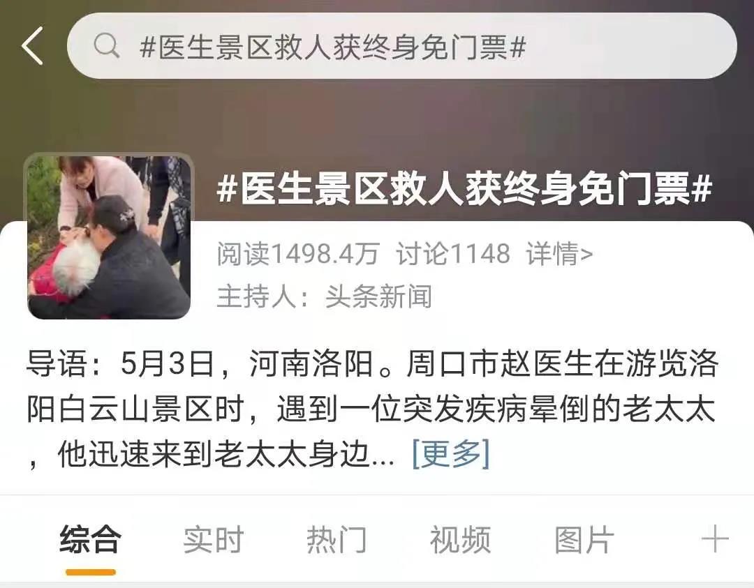 5月3日下午,周口市妇幼保健院主治医师赵一品在游览洛阳白云山景区的途中,遇到一位突发疾病晕倒的老太太。听到家属呼救,赵一品迅速来到晕倒的老太太身边,协助家属清理了老太太口中的食物残渣,让病人平躺等待救援,直到老太太逐渐恢复意识、面色红润之后才默默离开。景区在得知赵医生见义勇为的事迹后,向赵一品医生送出了感谢信,免除他此行在白云山的所有游览、住宿费用,并为他送出了终身免门票游 览洛阳白云山的荣誉游客证书。