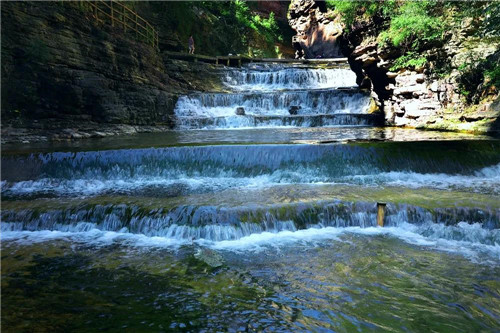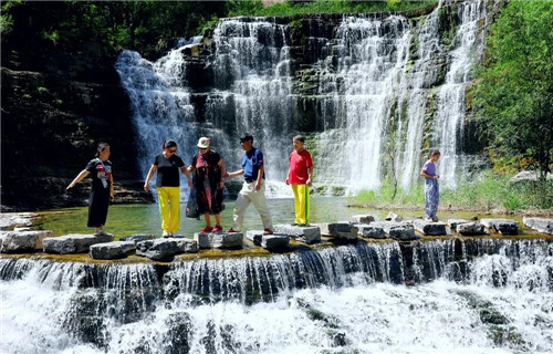 雨后观瀑,更加壮观,水流沿石级层层流下,泛起粼粼的水光,水中垂柳依依,碧波荡漾,好像从雄伟的太行山一步迈入了俏丽的江南。这里有九连瀑、二龙戏珠、含珠流泉等著名观景地,让你流连忘返。这里高山悬瀑落百丈,泉流潭水澄如镜,沿谷流下的溪水跌落成瀑,瀑落成潭,潭潭相连,构成了桃花谷山灵水秀的峡谷风韵。