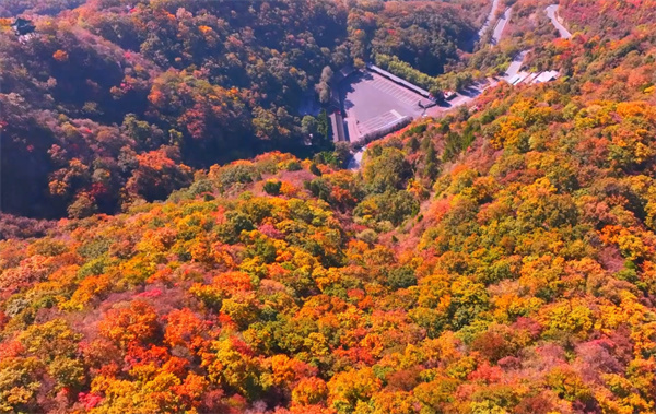 连绵不断的山峰色彩斑斓,层次分明 犹如打翻在山间的调色盘 盘山公路像一条美丽的彩带穿梭其中 呈现出一副绚丽多彩的秋日山水画卷