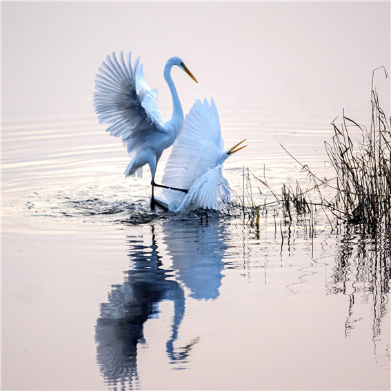 新乡市凤泉区凤泉湖里的白鹭在嬉戏 巩大安 摄