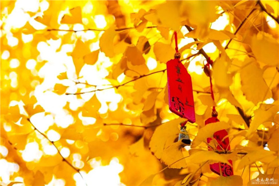 在蝶湖西北侧法云寺内,树龄1200多年的古银杏树的树叶已经全部变为金黄。