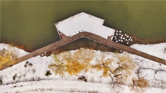从空中俯瞰湿地公园,绵绵白雪把整个公园装饰成雪的世界。 濮阳县融媒体中心供图