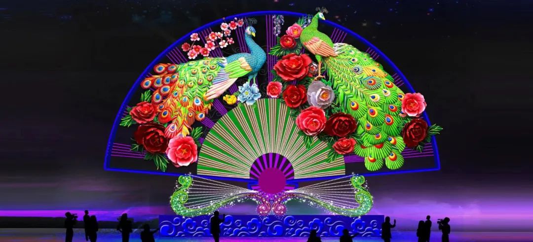 ——奔跑在林中的动物。《麋鹿》彩灯,高达3米,散点分布在园区内。有的麋鹿昂首挺胸,有的低头啃草,有的迈步前行,麋鹿造型的彩灯活灵活现,动感十足。《富贵孔雀》彩灯,长8米,高6米。巨大的扇形凸显国风,绿孔雀和蓝孔雀,搭配牡丹、梅花等,有中国传统绘画之风,凸显富贵吉祥。