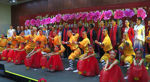 少林功夫表演结束后,现场观众纷纷起身,跟随小师傅一起学习太极拳的几种招式。野马分鬃、白鹤亮翅、搂膝抝步……现场观众认真模仿小师傅的一招一式,在练习太极的过程中体会东方智慧。演出结束后,现场观众集体鼓掌致意,久久不愿离场,争相与演员合影。