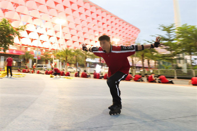 开幕式上,犹廷伟参演的节目是《深海》,他和小伙伴们骑着平衡车,扮演成鲨鱼、海豚等海洋生物入场。“之前就学过平衡车,所以很快就熟练了。我们的行进路线是S型,控制住速度和平衡就行。”但联排之后,小伙子发现并没有想象中的那么简单:“联排和训练不一样,上场后看到有那么多演员,看台上还有那么多观众,不自觉地就紧张,所以也没少出现失误。”后来,犹廷伟琢磨出了克服“心魔”的诀窍:“我就想啊,那么多演员呢,观众也不一定就会注意我。”这么一想,倒也不紧张了。20日晚上的彩排中,犹廷伟顺利完成了演出任务,对正式演出也有了更大的信心。相对于上场表演,这位13岁的少年说这次经历给自己最大的收获是见识:“我比较内向,以前见生人都不太敢说话,经过了这样的大场面,也认识了很多朋友,这让我更自信了。”