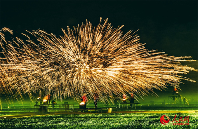 非遗打铁花表演璀璨上演,为游客带来了一场震撼的视觉盛宴。人民网 宋芳鑫摄