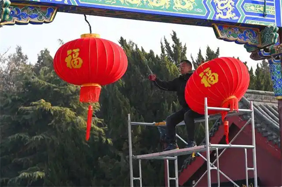 1月20日,开封市翰园碑林景区,工人正在悬挂红灯笼。