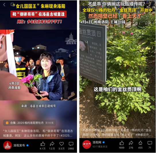 洛阳网短视频平台的#2025相约洛阳赏牡丹#,单话题全平台阅读量超1.1亿次,洛阳日报视频平台的原创话题#洛阳邀你看牡丹##洛阳春之约#等,总浏览量近1亿次。