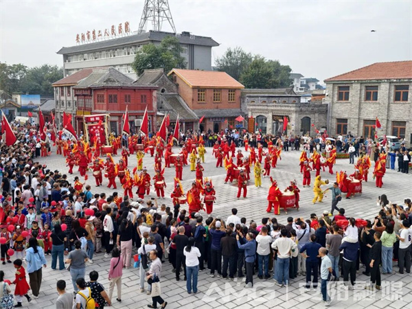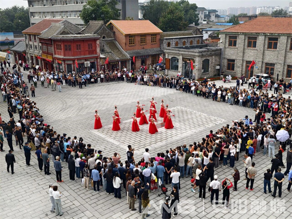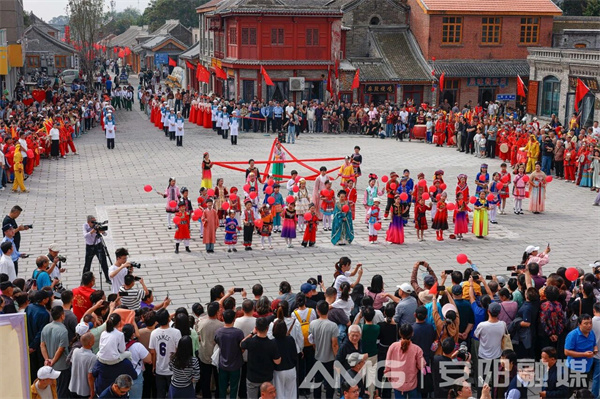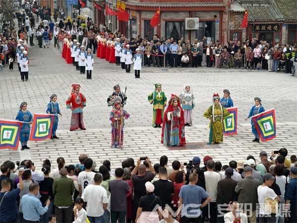 上午10时,鼓楼广场成了热闹的“文化舞台”。伴随着阵阵铿锵鼓声,吕村战鼓表演率先登场,身着红黄相间服饰的鼓手们动作刚劲豪迈,激昂的节奏瞬间点燃现场气氛,引得围观群众纷纷拍手叫好。随后,56名身着各民族特色服饰的孩童载歌载舞,用稚嫩的笑脸和欢快的舞姿,演绎出“56个民族一家亲”的温情画面,向祖国母亲送上祝福。作为国家级非物质文化遗产代表性项目,安阳县淮调也亮相开街现场。18位淮调艺人登台献艺,婉转悠扬的唱腔、精湛细腻的表演,让观众近距离感受这一古老剧种的独特魅力。压轴登场的舞蹈快闪更是活力十足,年轻舞者们用灵动的肢体语言,传递出百年老街重获新生的喜悦,不少游客拿出手机记录下这热闹瞬间。