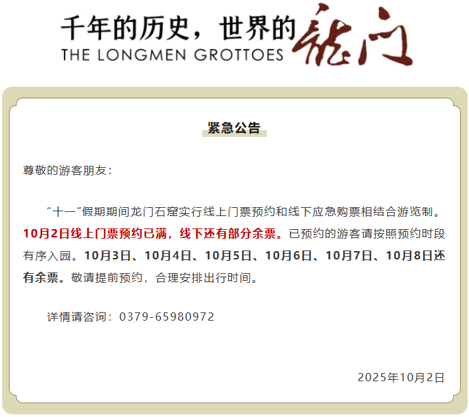 您的当前位置:网站首页 > 出行资讯 > >龙门石窟10月2日线上门票预约已满
