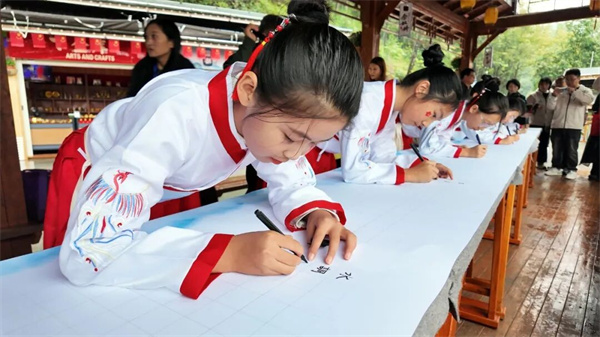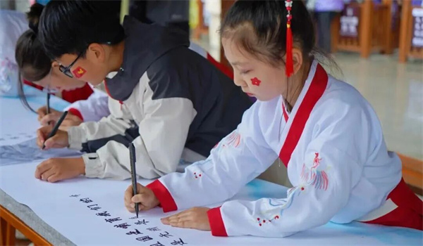 10月1日,在举国欢庆中华人民共和国76周年华诞之际,“我向祖国书心声·百名少年儿童书法雅集”活动于鸡冠洞温情启幕。百名少年儿童齐聚山河之间,以笔墨书写对祖国的热爱与祝福。