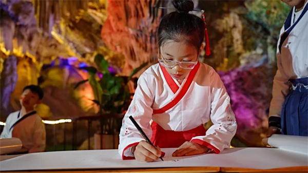 活动现场,小书法家们或挥毫泼墨,笔走龙蛇间尽显少年意气;或精雕细琢,一笔一划中饱含赤子情深。墨香袅袅,与溶洞湿润的气息交织弥漫,为这场国庆庆典增添了独特的文化意蕴。