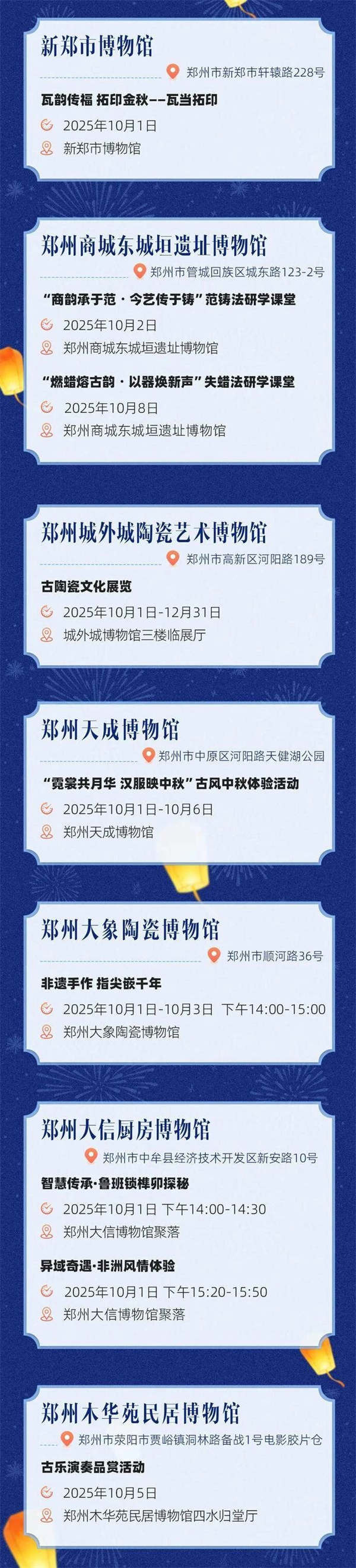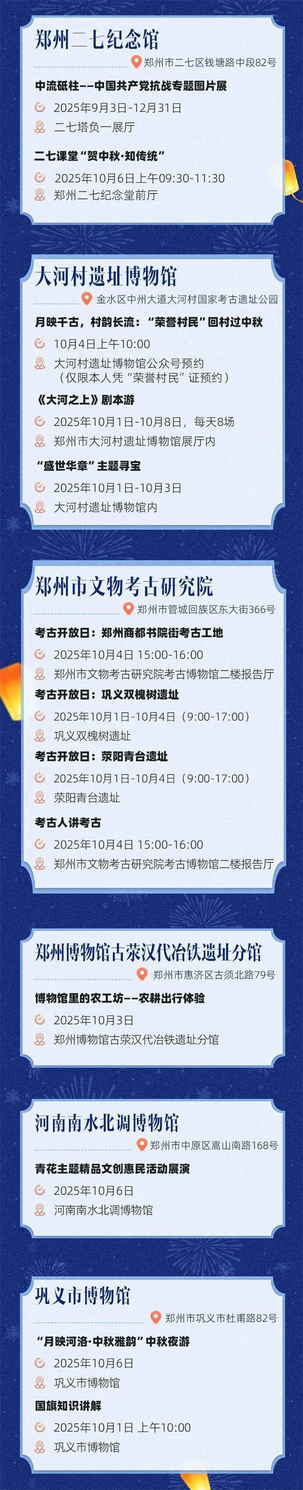 博物馆奇妙夜继续进行。10月6日晚,郑州博物馆开展“月满山河 共团圆”2025中秋云游夜活动,预计人数达3000人。郑州商代都城遗址博物院开展城隍庙里赏佳月活动。巩义市博物馆“宋宴映月・礼溯千年”雅宴等。郑州市文物局还将开展“今宵月郑圆”线上直播活动,传承节日文化,打造城市记忆。