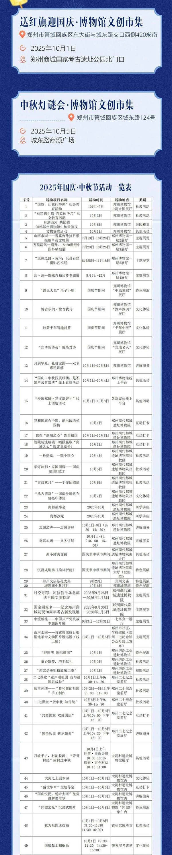 为切实满足市民群众的节日文化需求,充分展现郑州作为“商都文化之城”的独特魅力,今年国庆中秋假期,郑州市文物局以“郑是金秋 月满商都”为主题,精心策划了10类191项多彩纷呈的活动,为广大市民群众呈现丰富多彩的节日文化盛宴。