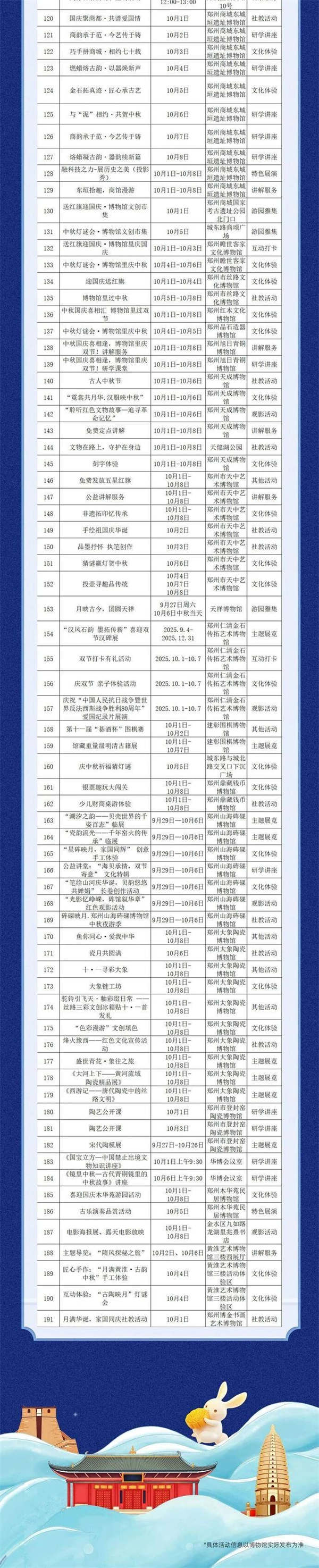 全市文博单位将推出10类191项活动,涵盖19个主题展览、16项讲解服务、5个游园雅集、9项特色展演、49项文化体验、12项互动打卡、40项社教活动、20项研学讲座、8项观影活动及13个其他活动,覆盖郑州博物馆、郑州商代都城遗址博物院等20余家重点文博单位,形成“展览+体验+研学+宣传”的立体活动矩阵。