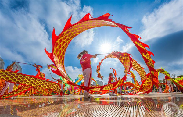 百人彩带龙表演“龙飞狮舞迎国庆”