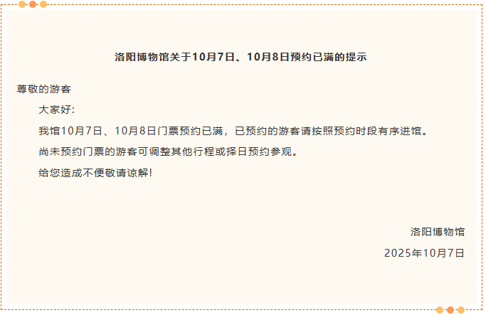洛阳博物馆关于10月7日、10月8日预约已满的提示