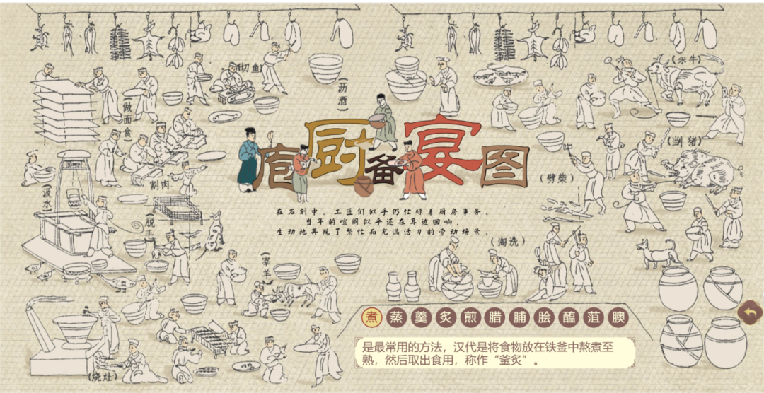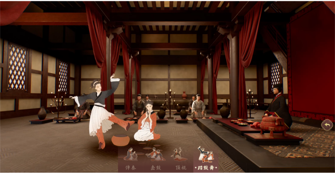 “汉家”云展依托庄园宴饮叙事,构建了“投刺→拜谒→主客宴饮→乐舞百戏→庖厨→田耕全过程线上体验流程,结合空间虚拟漫游的方式,逐层触发,凸显主线叙事逻辑性,确保观众对于汉代庄园宴饮认知体验的完整性,并可实现田耕、仙居场景的跳转。