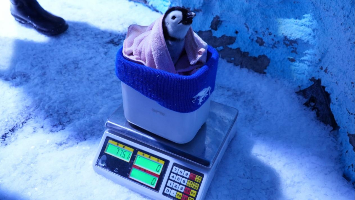 刚满月的帝企鹅宝宝身披灰色绒羽,头部毛发为黑色,拥有明显的白色眼圈和两只小眼睛,十分惹人喜爱。今年的帝企鹅繁殖季,保育员发现“元元”的父母再次成功配对,并在7月8日产下一枚企鹅蛋,经过68天左右的孵化期,小企鹅在9月13日顺利破壳。保育员告诉记者:“帝企鹅家族是由爸爸孵蛋的,刚出生的小企鹅需在父亲的育儿袋中获得庇护。尽管该只帝企鹅爸爸已有一次育雏经验,反刍行为仍显生涩,因此保育团队会辅助喂养一些磷虾和鱼肉,并持续记录幼崽的摄食、排泄与体重变化,全面保障幼崽健康成长。”