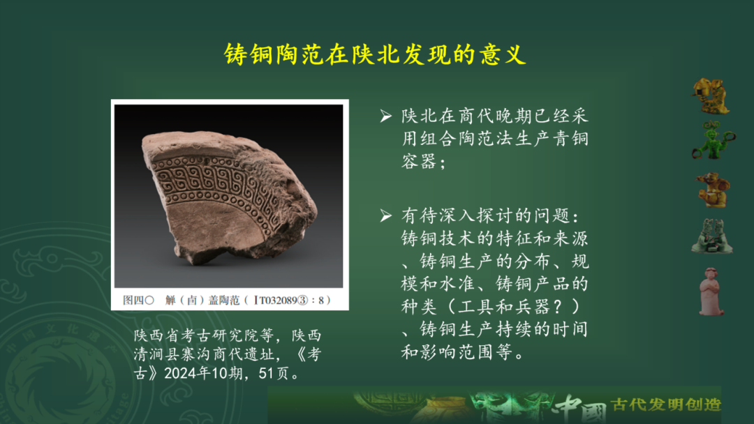 英国剑桥李约瑟研究所、剑桥大学麦克唐纳研究所教授梅建军作了题为“陕北出土商代青铜器及其与中原的关系”的主旨报告,从近年来考古发掘的新材料出发,对陕北地区在商代是否具备本地生产青铜器的可能性进行了深入探讨。他先介绍了如何寻找商王朝边界的最新研究动态,引发关于考古学文化、族群与国家的理论思考。他详细阐述了陕北出土青铜器的科学分析研究,将陕北青铜器的铅同位素比值进行了不同维度的对比:与殷墟对比、不同时代对比、与各地铜矿对比及与东、西秦岭铅矿对比,结果表明,其青铜礼容器的确应该来自安阳,北方风格器物也可能来自安阳或使用来自安阳的原料在当地制作。通过对殷墟出土兵器、工具和铸铜遗物的不同种类、不同风格器物以及不同材料青铜器所含高放铅和普通铅的对比,揭示出殷墟出土的北方风格青铜器可能为安阳本地生产自用或为北方的族群生产。然而,近年来在陕北地区包括寨沟在内的一系列遗址不仅发现了大型夯土建筑和高等级的墓葬,还出土了一批类型丰富多样的青铜器和铸造铜器所用的陶范残块,陕北出土的青铜器显示出与安阳尤其是铸铜材料上的密切联系,表明陕北地区青铜文明在商代获得了显著发展,商代晚期已经采用组合陶范法生产青铜容器,在陕北也存在重熔商人的青铜礼容器以制作青铜兵器和工具的可能性。