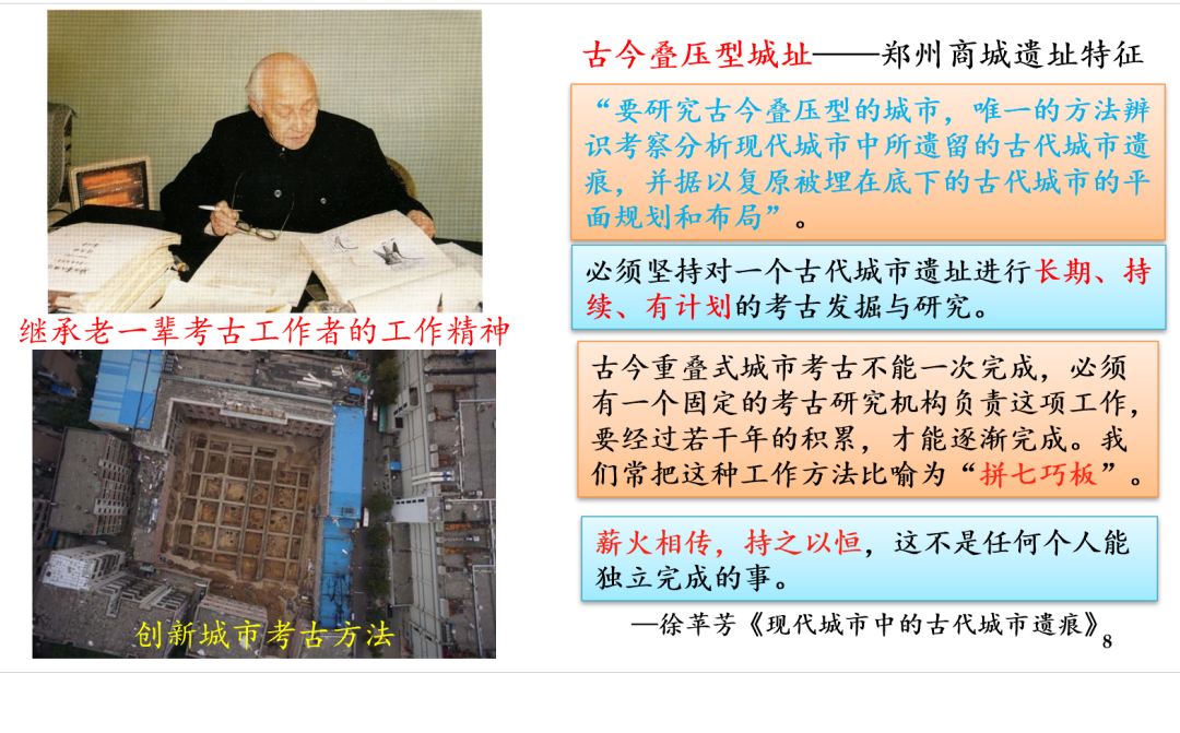 河南省文物考古研究院杨树刚研究员作了题为“郑州商城近年考古成果概览”的主旨报告,以致敬-传承-保护为主线系统回顾了围绕郑州商城遗址所展开的一系列考古工作及其重要收获。他向以安金槐等为代表的老一辈考古工作者致敬,重温了郑州商城自1955年发现并确认以来,一代又一代考古人取得的丰硕成果。强调要继承老一辈考古工作者不畏艰辛、探索真知的实干精神,坚持长期、持续、有计划的考古发掘与研究。他全面梳理近十年来河南省市考古工作者开展的考古工作,总结了郑州商城以商代遗存为重心的考古新成果,如仓储设施、冶铜作坊遗存、制骨活动遗存、城市水利设施遗存、高规格墓葬和祭祀遗存,这些成果不断刷新对这座早商都邑的新认知,要以郑州商城——“探商”的重要阵地为支点,再向前“寻夏”有了更切实的抓手。同时,在城市考古工作理念的指引下,按照“纵向找沿革、横向探布局”的工作方法,陆续发现了战国人骨埋藏沟、唐代丛葬坑、道路及明清祖师庙建筑基址等历史时期的重要遗存,这些发现延伸了城市历史轴线,丰富了城市历史内涵。他表示,新时期考古工作,不仅全面展示了郑州商城的城市文明,为深入探究商代郑州城提供更多线索,也为探索郑州商城这样的古今叠压型城址的城市考古提供了重要案例。未来,要加快考古资料整理与出版,加强研究与阐释,推进考古成果惠及更多社会公众。