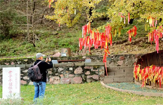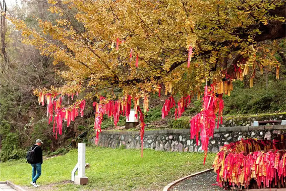 皲裂的树皮纹理如岁月刻痕,粗糙却满含力量,与树下轻摆的红绸形成鲜明对比 —— 红绸在镜头里化作流动色块,为苍劲古木添上鲜活人文温度。游客举相机的身影,与古树的伟岸形成趣味尺度对照,快门按下,便定格下人与树、今与古的对话。