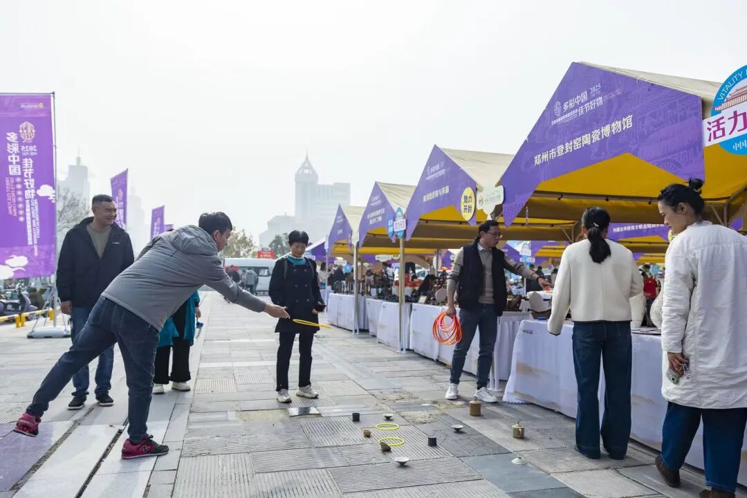 登封窑展台前笑语不断,游客们正用免费套圈赢取水墨瓷、麦秆画茶具,将一份份东方雅趣带回家中。