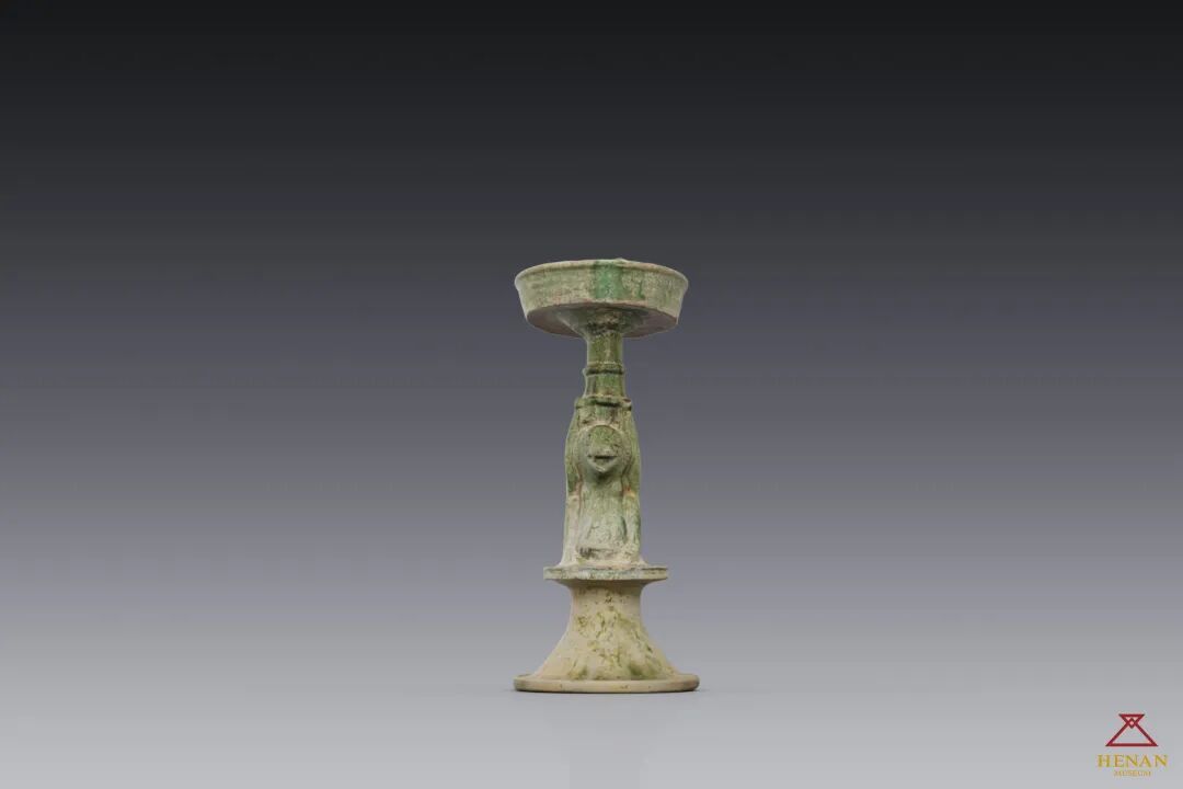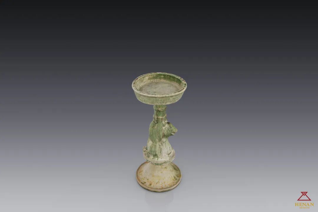 绿釉熊顶陶灯,汉代陶明器,通高38厘米,河南博物院藏。低温釉陶,轮、模制作。灯顶端为灯盘,圆形直口,平底。中部为一熊托举灯盘构成长柄,熊耳竖起,目视前方,背拱起,下端为喇叭状座,通体饰绿釉。