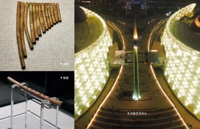 中间晶莹剔透的装饰柱,是设计师根据河南出土的 8700 年前中华第一笛贾湖骨笛而做。