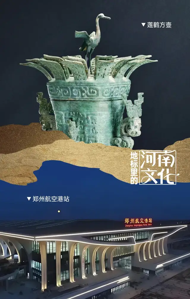 郑州航空港站以春秋时期青铜器莲鹤方壶为设计灵感,巧妙融合了古韵与现代站房功能,它出土于郑州新郑,作为河南博物院镇馆之宝,莲鹤方壶是中原文化的璀璨符号,承载着商周青铜文明的厚重底蕴,以其为灵感能让交通枢纽成为河南文化的 “流动名片”。